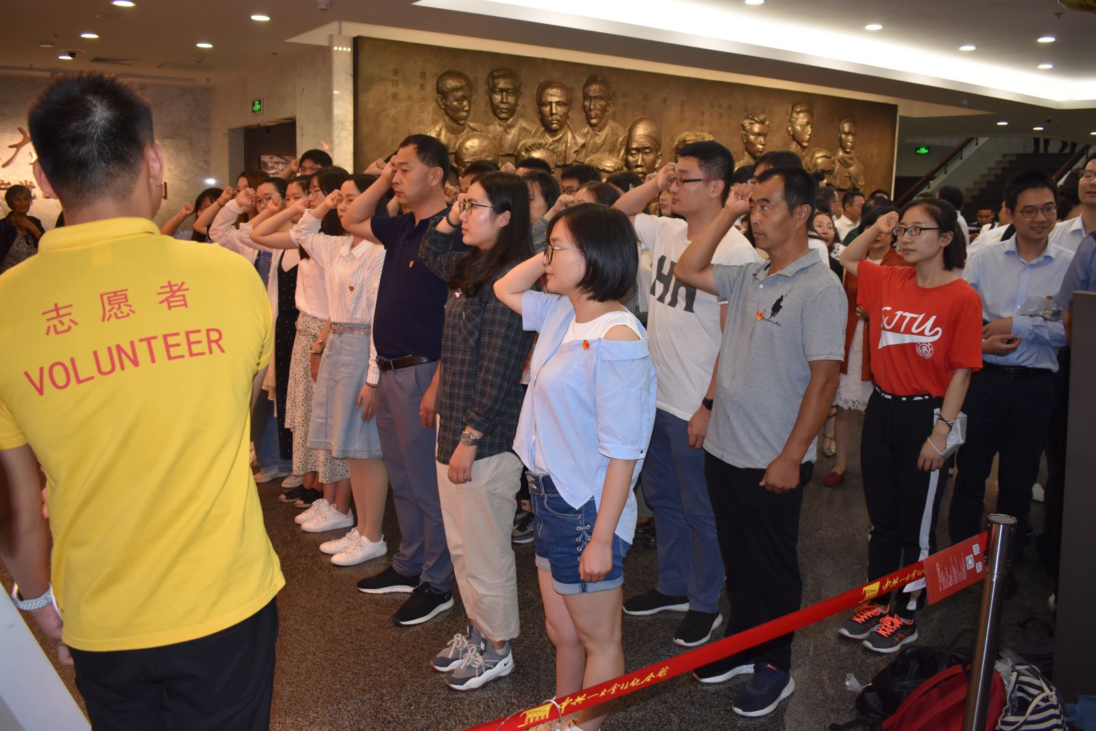 进入馆内,鲜红的党旗首先映入眼帘,洋溢着神圣与庄严。在场馆志愿者的带领下,大家重温了庄重的入党宣言并在党旗下合影留念。紧接着,党员同志们来到纪念馆二楼,二楼展厅内展示了许多珍贵的历史文物,展示了革命先辈们留下的历史资料。
