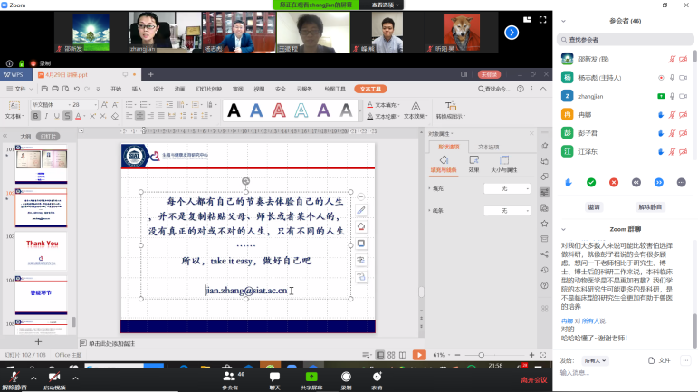 此次“科学精神进课堂”系列主题班会邀请到的嘉宾是中国科学院大学博士生导师、中国科学院深圳先进技术研究院研究员、生殖与健康发育研究中心主任张键老师。上海交通大学学生处副处长龚强、农业与生物学院团委书记熊峰、2019级二班班主任程玉强莅临现场,农业与生物学院2018级动科班、农业与生物学院2019级同学、《动物药理学》2020年春季教学班全体同学参与本次班会。会议由2018级动科班班主任杨志彪老师主持。