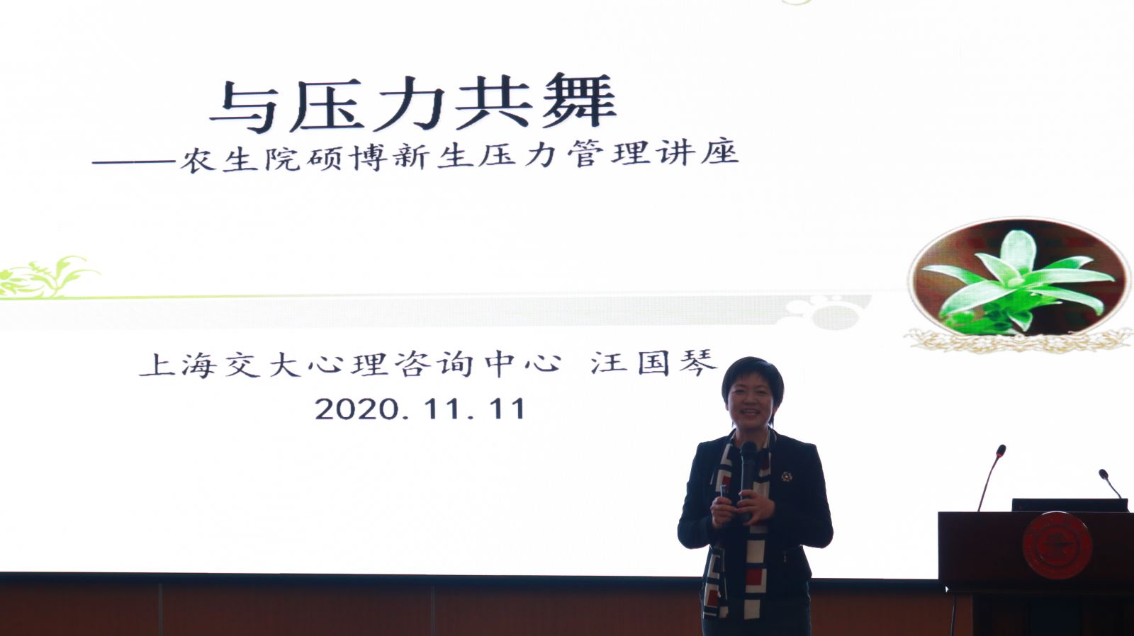 11月11日,上海交通大学农业与生物学院在学院学术报告厅举办了针对2020级研究生的心理健康教育活动,邀请上海交大心理咨询中心副主任汪国琴老师为学生们做《与压力共舞》的专题讲座。学院党委副书记郑浩、学工办主任金丽鑫、2020级硕士思政教师李明和全体2020级硕博士新生出席活动。活动由郑浩老师主持。