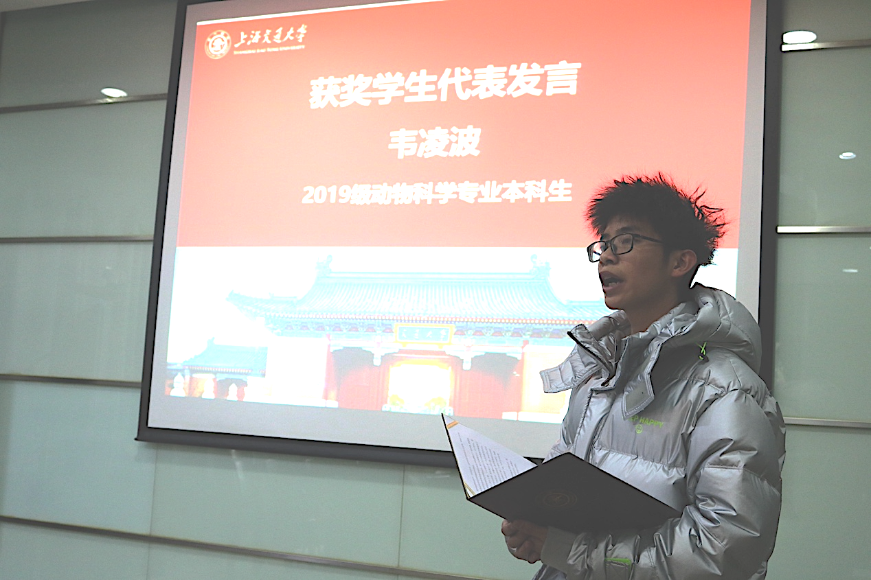 2019级动物科学专业韦凌波作为获奖学生代表发言。他表达了对陈宇峰学长以及学院的感谢,也表明将一直以珍惜、感恩、努力作为自己的人生格言,并承诺将在学习上永不懈怠,在学生工作中热心服务同学,不断开拓进取,积极上进,常怀感恩之心,不辜负社会的期待,不负青春与梦想,做一个有责任、有担当的人。