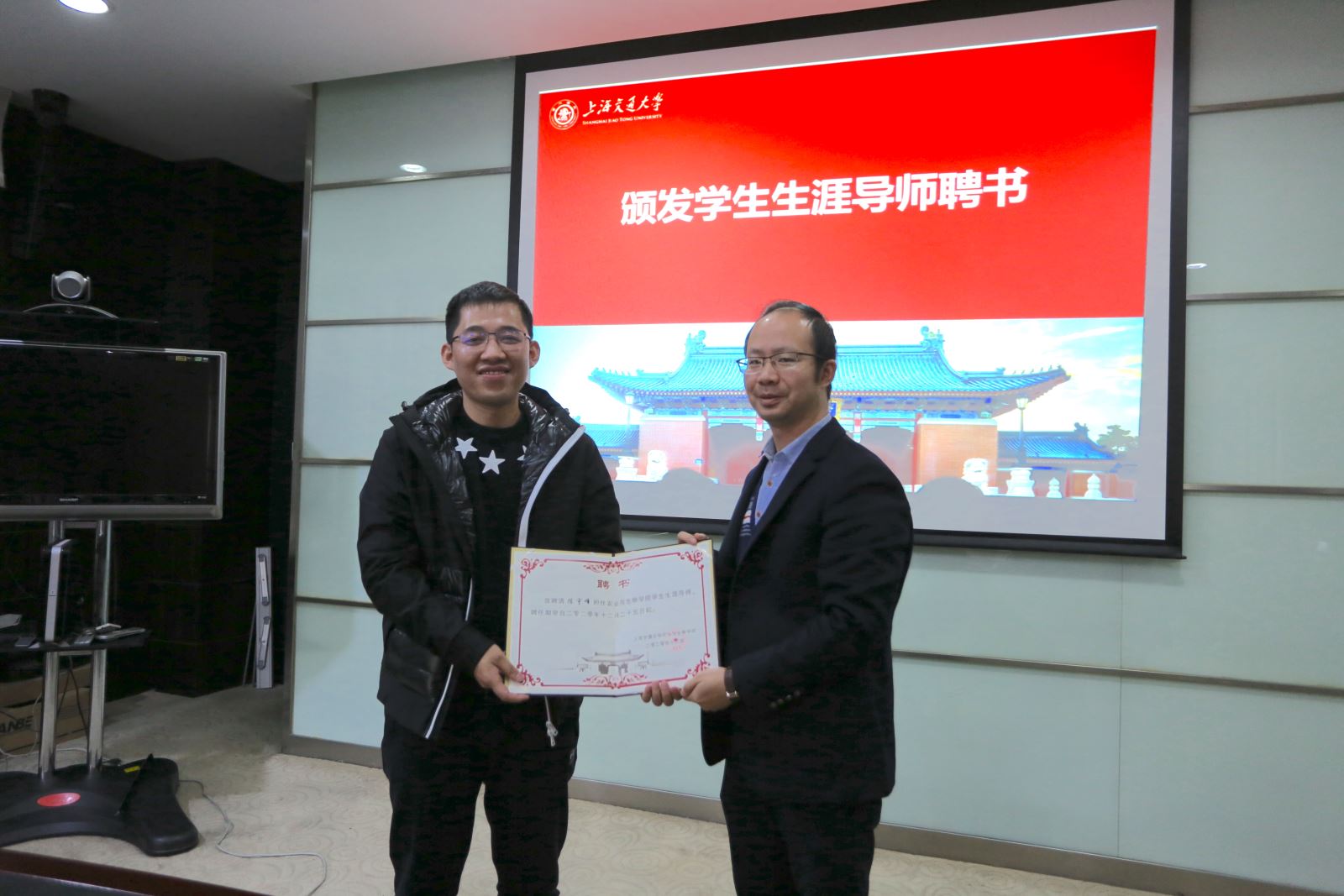 为指导学生更好地规划职业生涯发展规划,特聘任陈宇峰为学生生涯导师,由郑浩老师为陈宇峰学长颁发聘书。