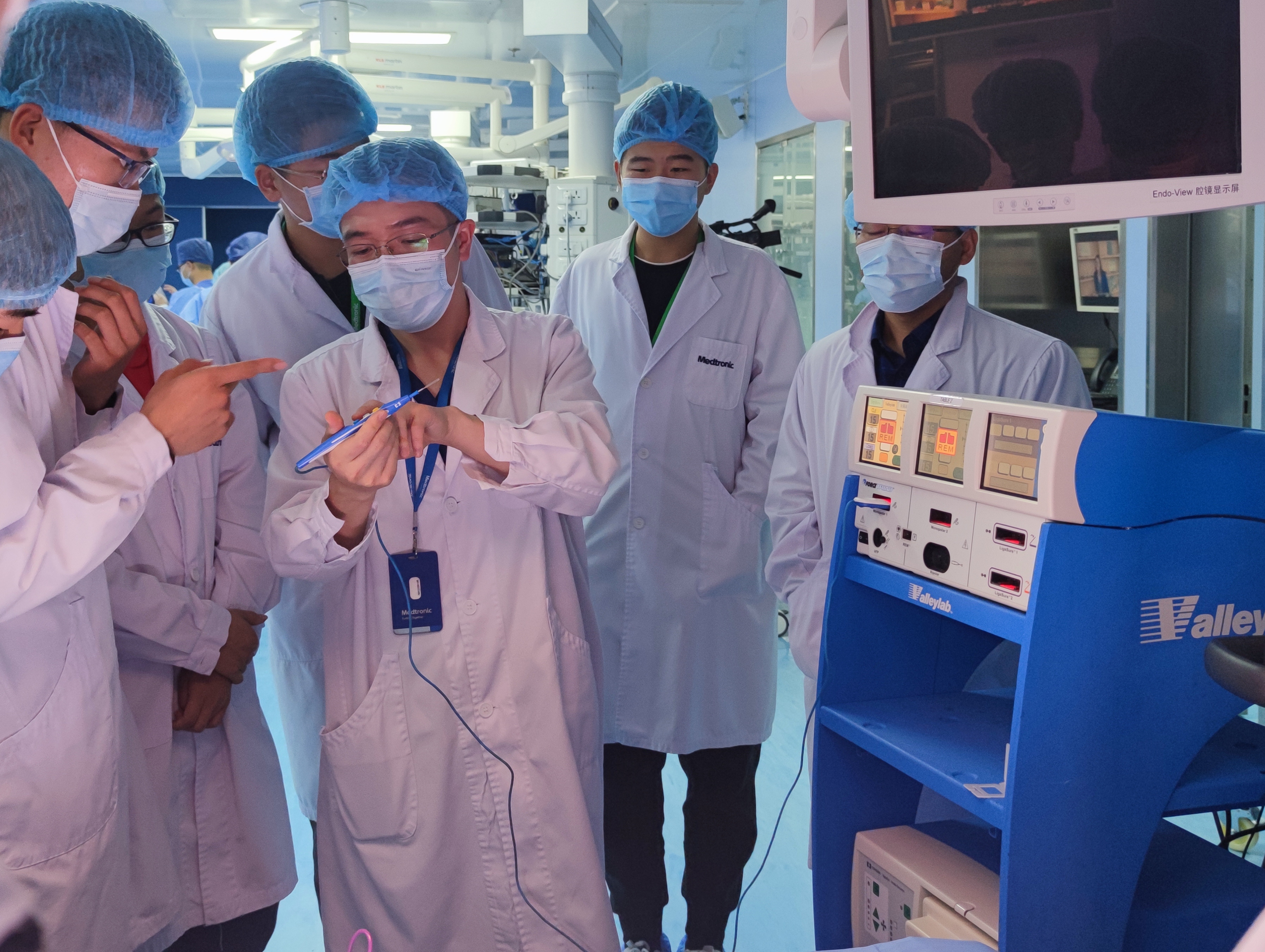 最后同学们进入手术室,有医生正在利用小型猪进行肾透析手术练习。朱老师对实验室中的各种仪器和手术器材进行了详细的介绍,并让同学们进行了简单的体验。