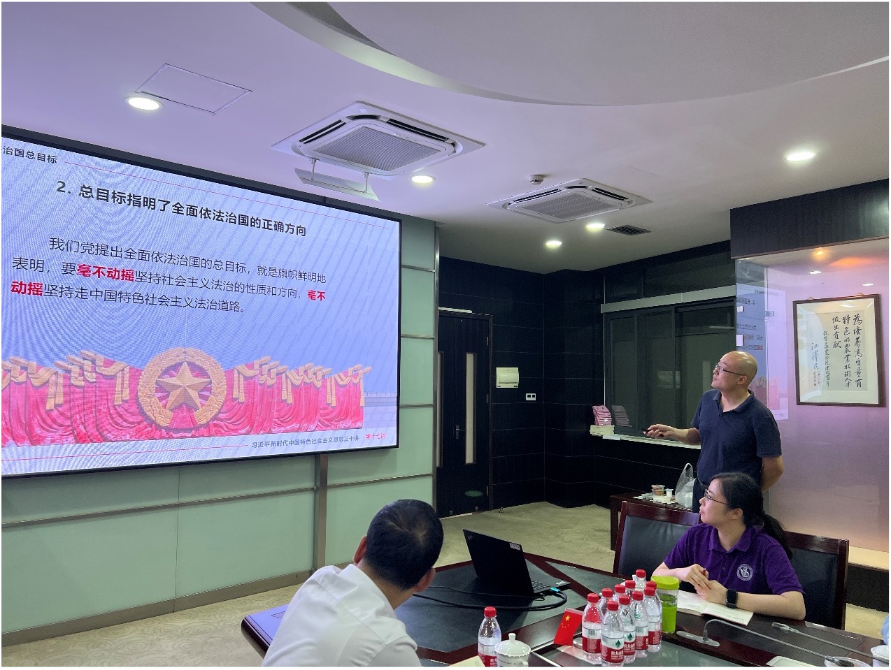 党委委员王大鹏以“加快建设社会主义法治国家”为题,领学习近平法治思想。主要介绍了明确全面推进依法治国总目标、坚定不移走中国特色社会主义法治道路、加快建设中国特色社会主义法治体系、深化依法治国实践和加强党对全面依法治国的领导等五个方面的内容。习近平总书记指出,全面依法治国是中国特色社会主义的本质要求和重要保障。必须把党的领导贯彻落实到依法治国全过程和各方面,坚定不移走中国特色社会主义法治道路,完善以宪法为核心的中国特色社会主义法律体系,建设中国特色社会主义法治体系,建设社会主义法治国家,发展中国特色社会主义法治理论,坚持依法治国、依法执政、依法行政共同推进,坚持法治国家、法治政府、法治社会一体建设,坚持依法治国和以德治国相结合,依法治国和依规治党有机统一,深化司法体制改革,提高全民族法治素养和道德素质。