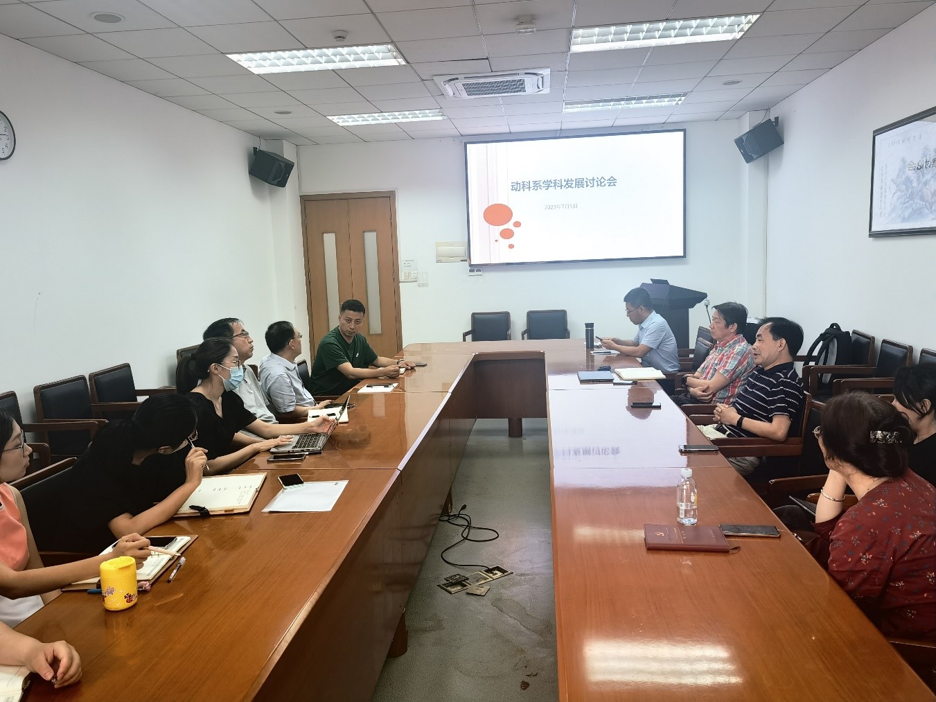 系主任袁聪俐老师提出了研究生培养、人才引进、有组织科研、学科建设、对外交流等议题,供全体教职工讨论。徐建雄、孟和、马裴裴、孙建和、王欣、严亚贤、张洪才等老师纷纷提出自己的建议,明确了研究生培养应该严格过程管理、聚焦研究方向;人才引进应该积极宣传、重点关注;科研方向需要聚焦到宠物遗传育种、营养饲料、疾病防控上来,并积极对接市场需求,做真正能够产生价值的科研。