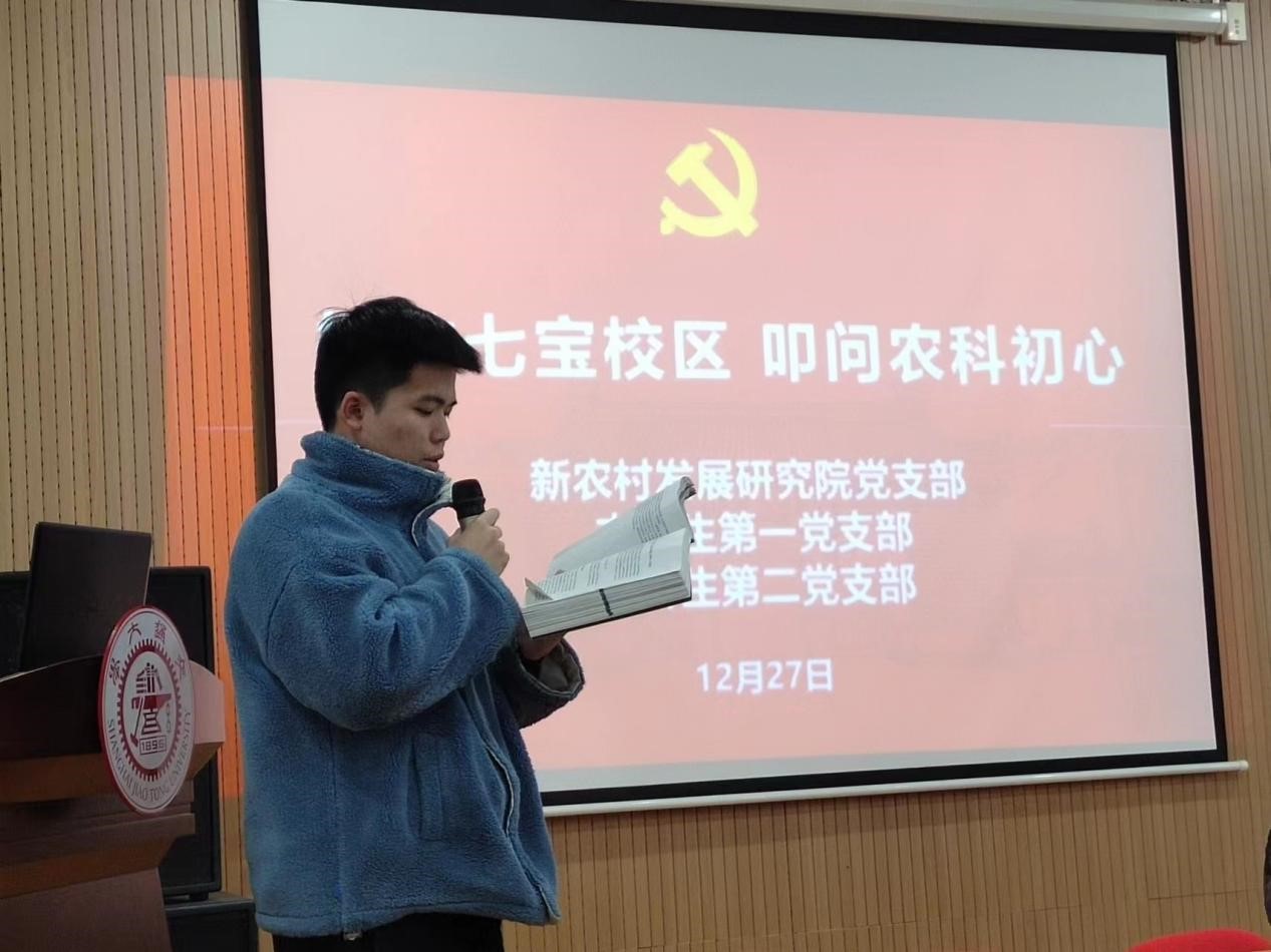 12月27日,新农村发展研究院党支部联合本科生第一党支部、第二党支部在上海交通大学七宝校区开展“探访七宝校区,叩问农科初心” 师生联合主题党日活动。学院党委书记、新农村发展研究院常务副院长侯士兵,学院关工委分会常务副主任谢立平,学院副院长、新农村发展研究院副院长刘志诚,新农村发展研究院副院长蔡保松,学院科技办宋士任等领导与师生团队相聚七宝校区,新农村发展研究院原区域发展研究所所长黄国桢教授作特邀报告,在三个支部支委曹正伟、郭辰阳和张馨予带领下,共30余人参加了活动。