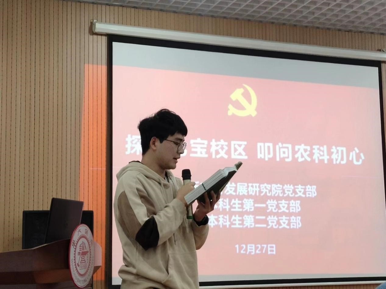 “追忆章”环节由本科生第二党支部副书记张馨予主持。本科生第一党支部雷睿燊、第二党支部白益鸣两位同学分别朗诵上海交通大学农学院院史《春华秋实》选集内容,通过分享农学院建院、归入上海交通大学两个关键时间节点,共同回忆学院那段艰苦创业与追求卓越的历史。