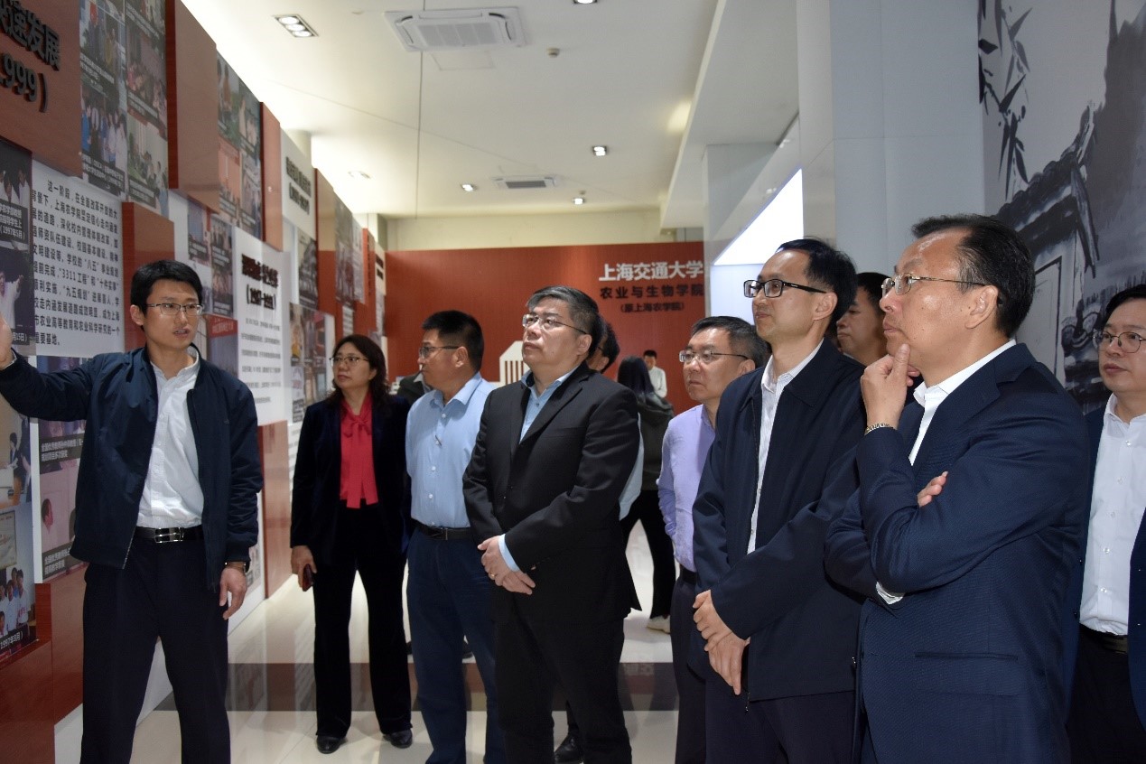 在学院展厅,农业与生物学院党政办公室主任杜骁介绍了学院的发展历史与现状。从1959年上海农学院成立,到1999年并入上海交通大学,经过65年发展建设,学院现拥有4个系科、306名教职工、1100余名在校生、91个PI组,学院积极对接国家乡村振兴和种业振兴重大战略,依托学校综合性大学学科优势,不断前进,逐步迈向国内国际农科前列。