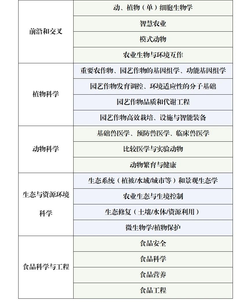 围绕国家新农科建设,聚焦植物科学、动物科学、资源与环境科学、食品科学与工程四个领域,重点打造以下方向: