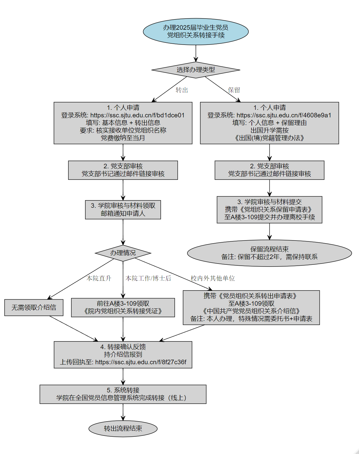 毕业集中办理:6月19日(周四)中午12:00前提交转出申请且完成支部书记审核的毕业生党员,凭《党员组织关系转出申请表》或《党组织关系保留申请表》,于6月19日(周四)14:00-17:00、6月20日(周五)9:00-11:30、13:30-17:00时间段至学院A楼3-109学生工作办公室集中领取介绍信并办理离校手续。
