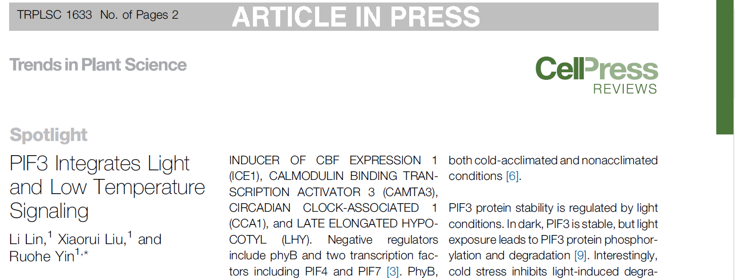 近日,上海交通大学农业与生物学院植物光控发育团队在Cell Press旗下的专业综述杂志Trends in Plant Science在线发表了一篇题为“PIF3 Integrates Light and Low Temperature Signaling”的热点推荐文章(Spotlight)。